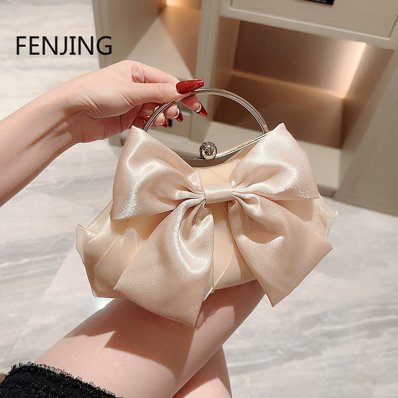 White Satin Bow Fairy Evening Bags Metal Handle Handbags for Women Wedding Party Bridal Clutches Purse Chain Shoulder Bag Feamle